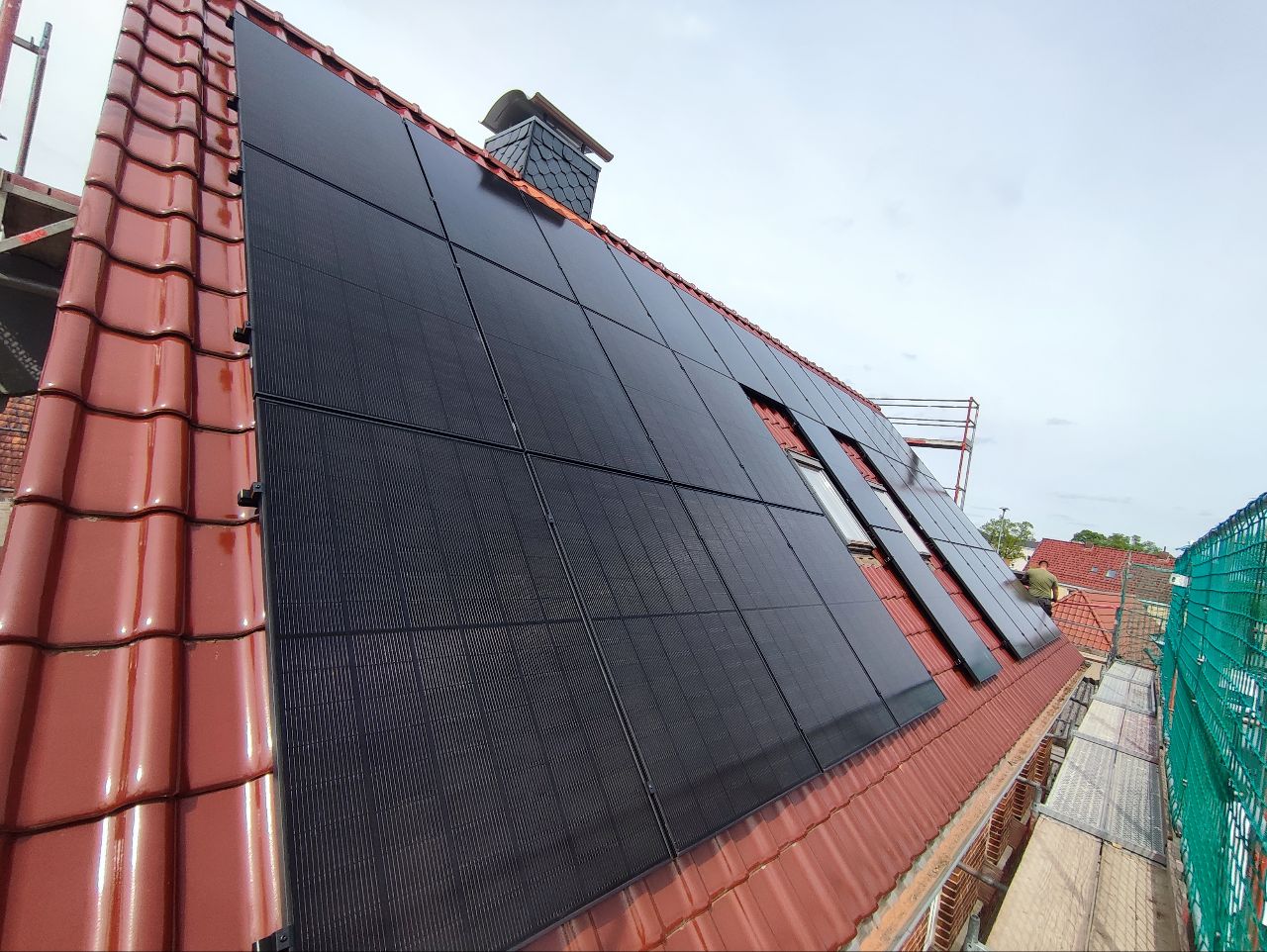 In Grabow durften wir auf einem Mehrfamilienhaus eine moderne Photovoltaikanlage installieren, die speziell zur Unterstützung einer Wärmepumpe konzipiert wurde. Auf dem steilen Satteldach wurden leistungsstarke, vollflächig integrierte Solarmodule montiert, die sich nahtlos in das Erscheinungsbild des Daches einfügen. Die glänzend roten Dachziegel bilden dabei einen ansprechenden Kontrast zur tiefschwarzen PV-Oberfläche – ein echter Blickfang mit Funktion.