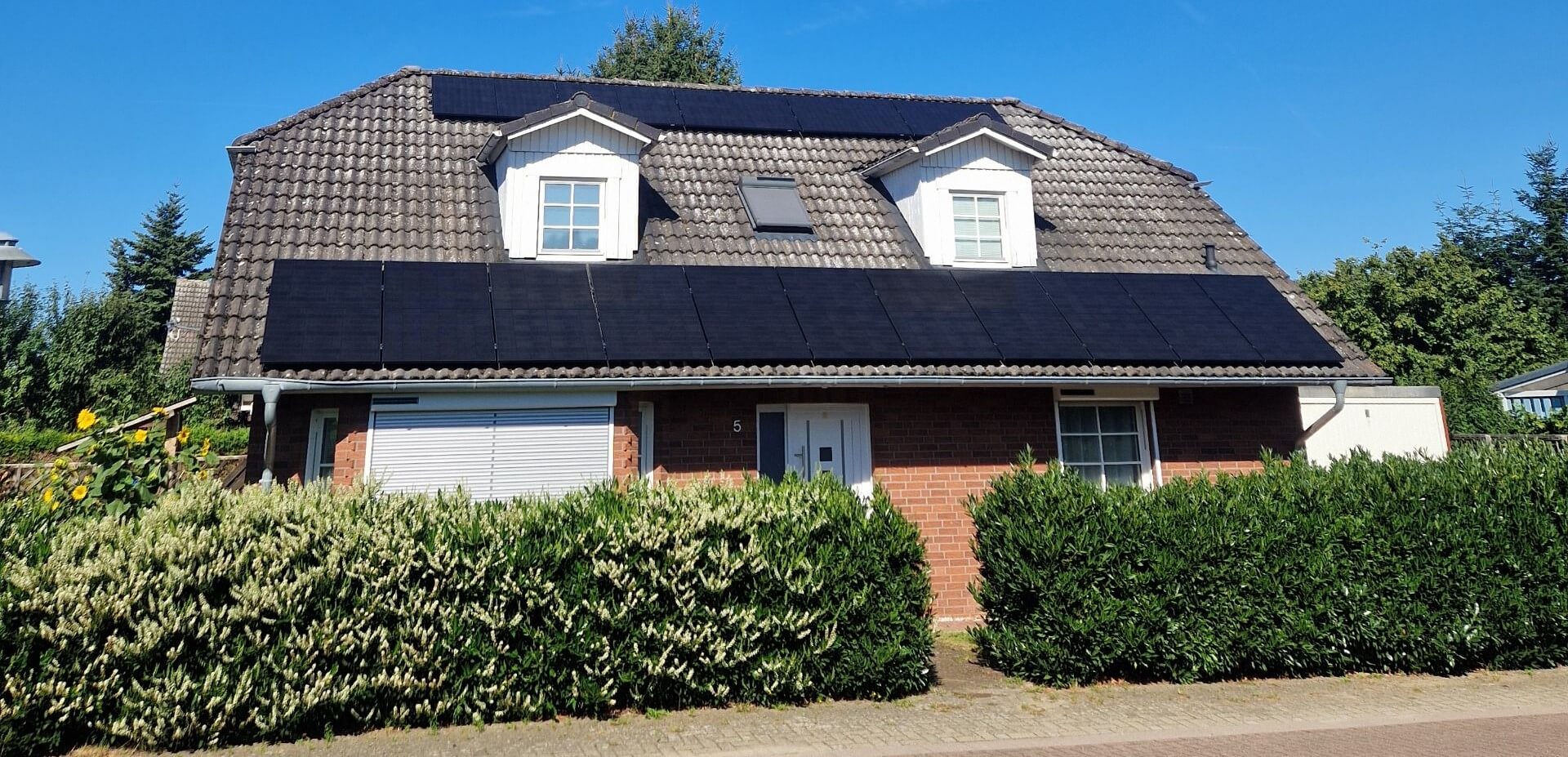 In Ludwigslust wurde auf einem Einfamilienhaus eine moderne Photovoltaikanlage zur Eigenstromnutzung installiert. Die Anlage fügt sich nahtlos in das bestehende Ziegeldach ein und überzeugt durch ihr elegantes, rahmenloses Design mit vollständig schwarzen Solarmodulen – ideal für anspruchsvolle Hausbesitzer, die sowohl auf Ästhetik als auch auf Energieeffizienz setzen.
